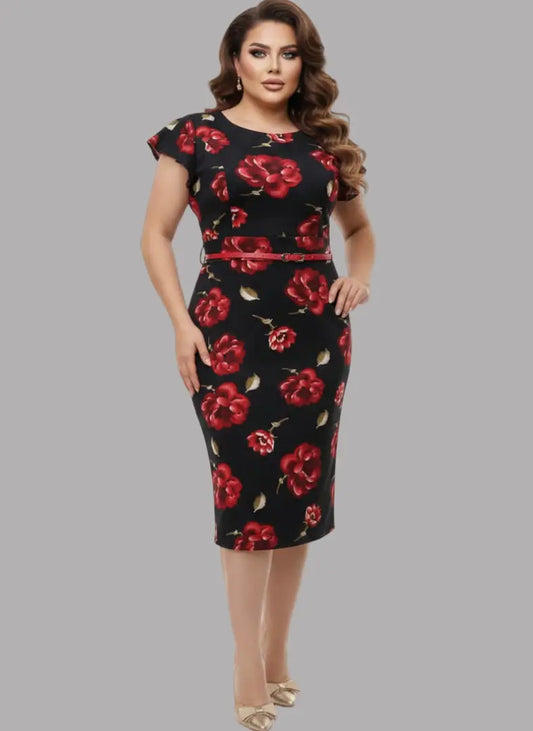 Vestido floral plus con cinturón rojo.