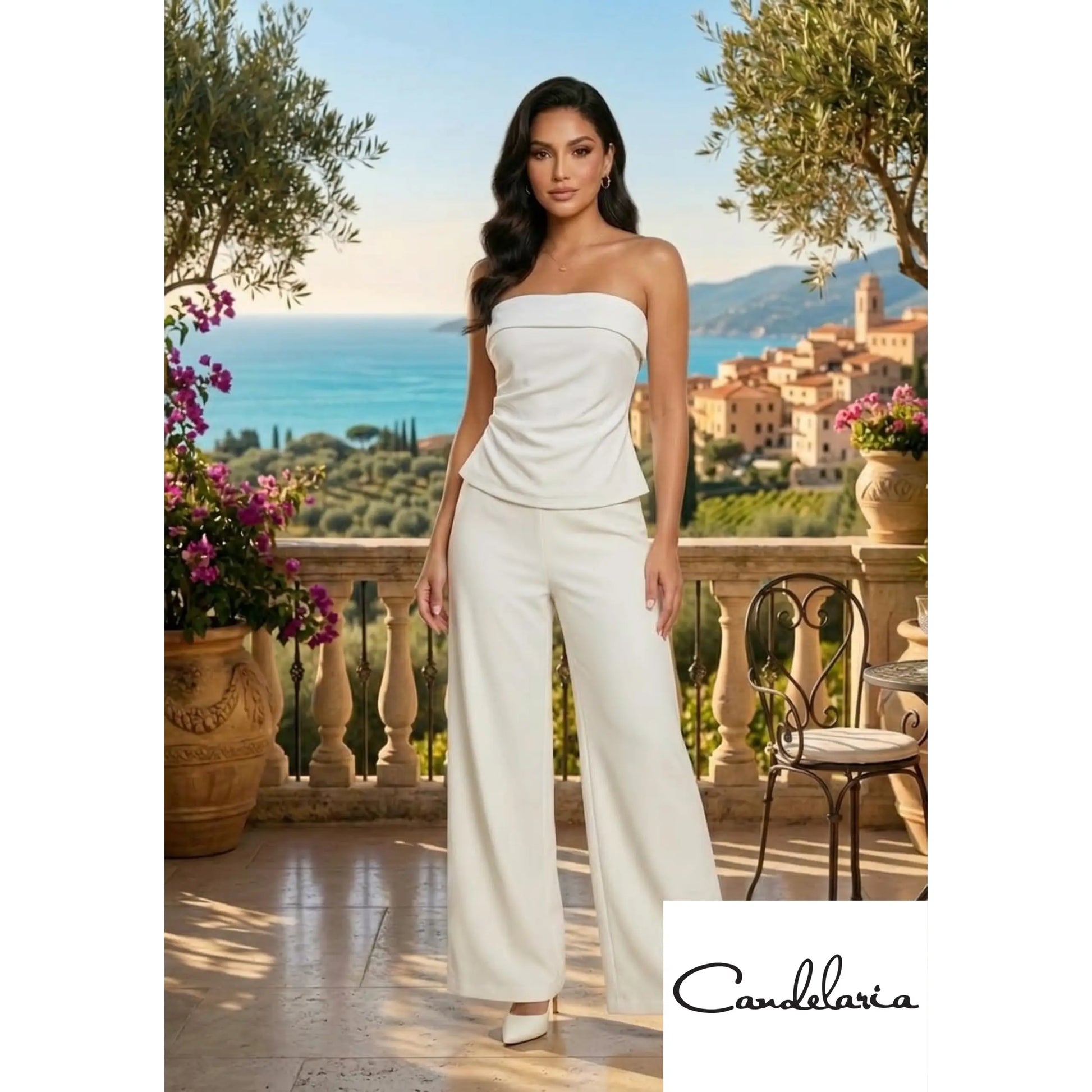 Destaca con la sofisticación impecable de este set blanco marfil, una prenda diseñada para proyectar un lujo minimalista y moderno. Este modelo resalta por su top estraple con drapeado sutil y un pantalón de bota ancha que alarga visualmente la figura, brindando un movimiento majestuoso al caminar.