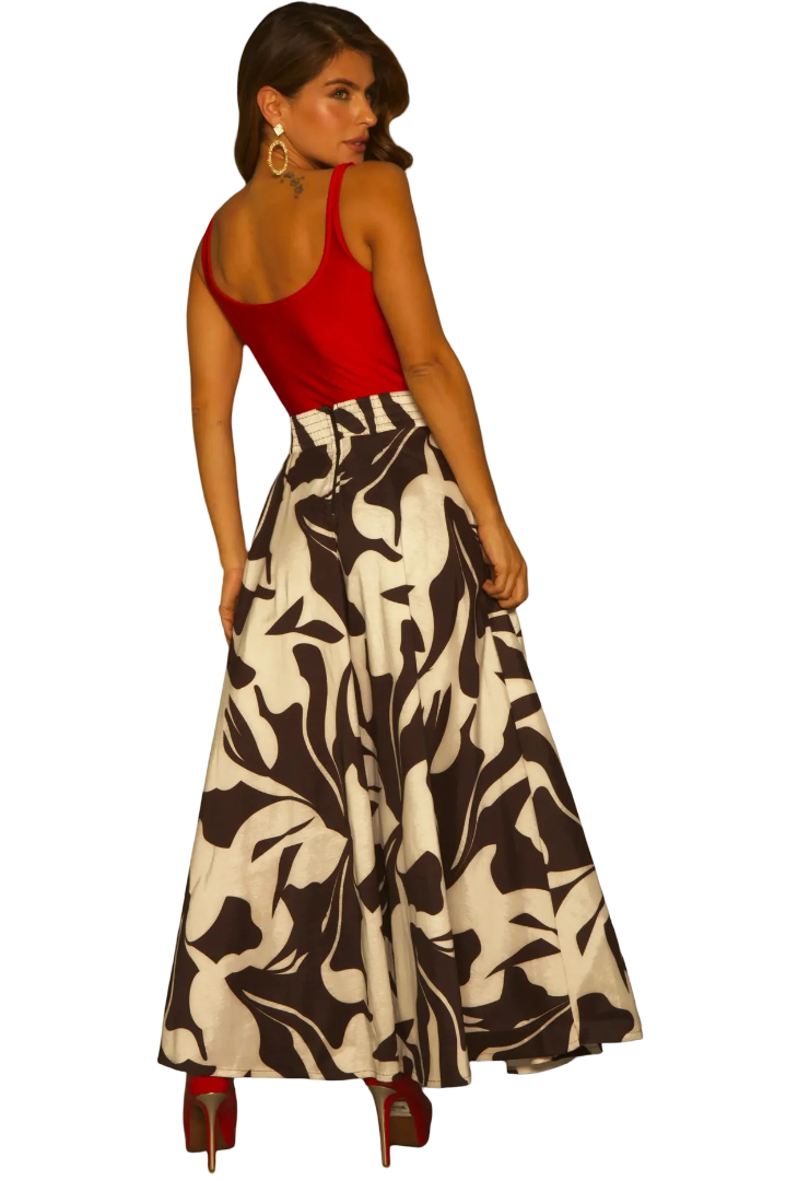 Atrévete a destacar con esta falda Estefania, que aporta un toque artístico y sofisticado a tu look. Su corte fluido realza la figura y brinda comodidad, mientras que la cintura alta estiliza la silueta. Combinada con un top rojo vibrante, crea un contraste audaz y elegante. Perfecta para eventos, salidas especiales o un estilo casual chic.
