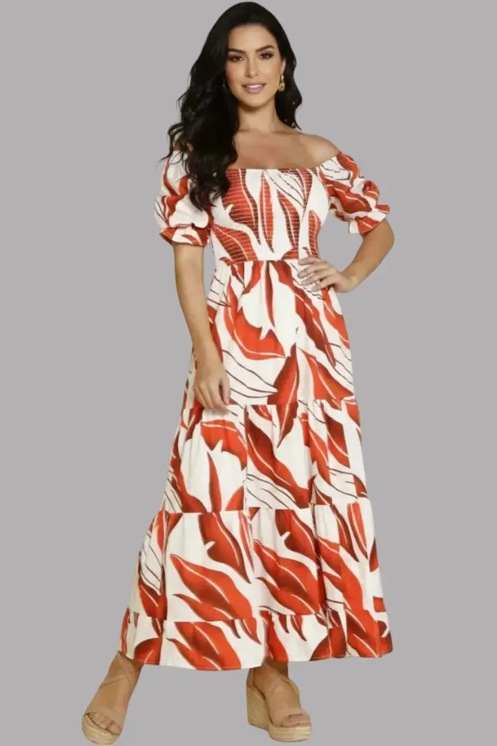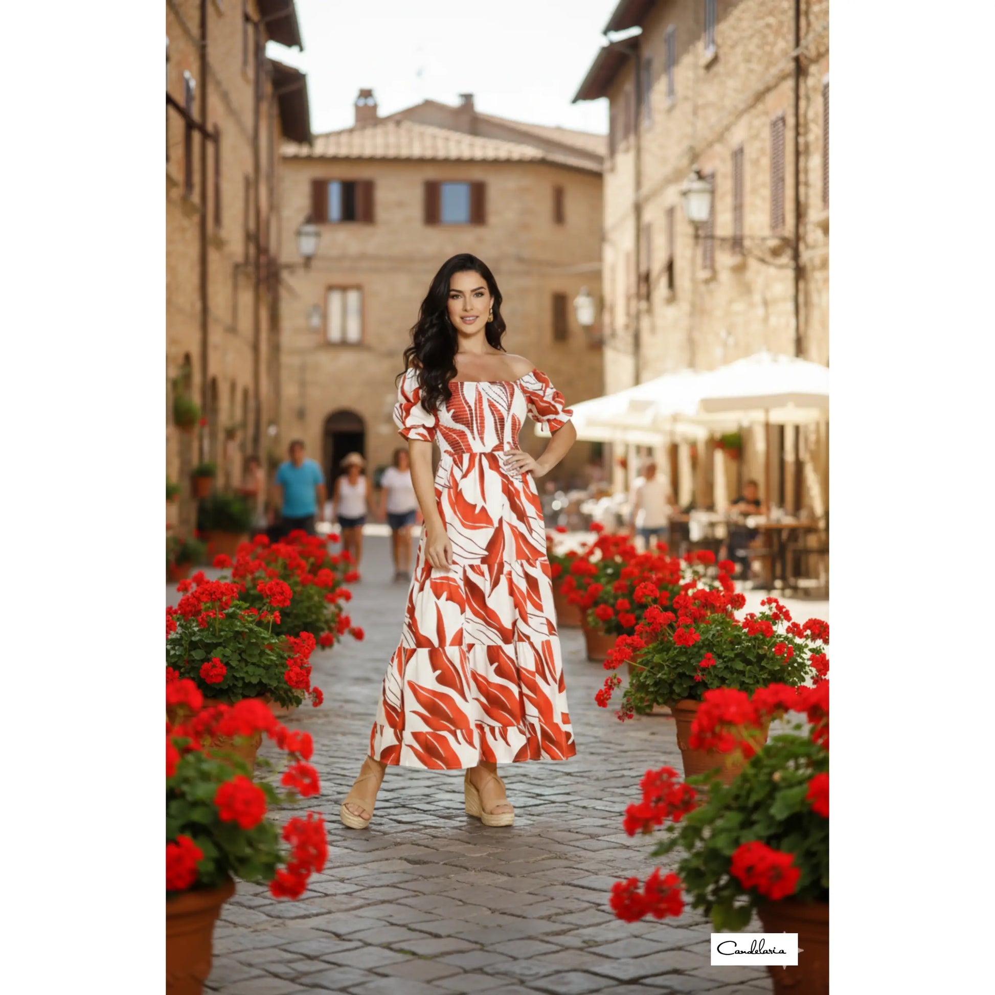 ¡El vestido "soñado" para tus días de sol y descanso! Este vestido terracota y verde es una belleza absoluta; el nido de abeja en el pecho hace que te horme divino y los hombros descubiertos te dan ese aire femenino y delicado. Es la prenda perfecta para estar bien en un paseo, un almuerzo campestre o una tarde de playa.