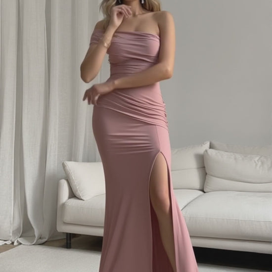 Detalle Diseño con drapeado asimétrico en el torso, falda entallada y abertura lateral profunda en la pierna.
