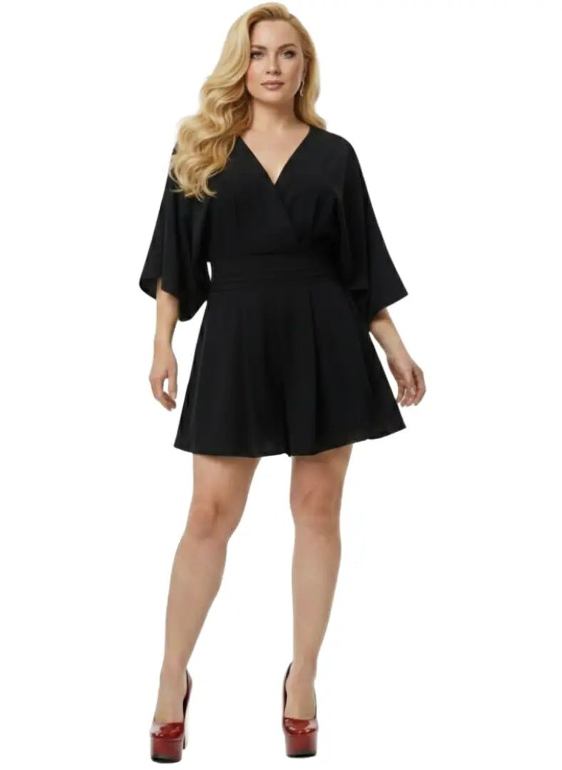 ¡El "salvavidas" con más estilo de tu clóset! Este vestido nocturno es una nota absoluta porque tiene lo mejor de los dos mundos: la elegancia de un vestido negro y la comodidad total de un pantalón corto. Las mangas mariposa le dan un aire súper fino y el fajón en la cintura te deja bien para cualquier invitación de última hora.