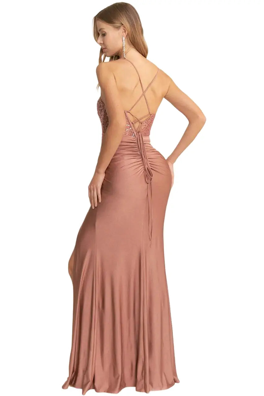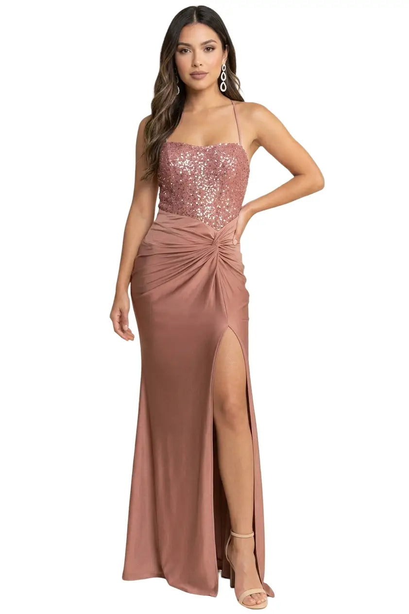 Brilla en tu próxima celebración con este espectacular vestido de gala que combina texturas de lujo. Este diseño destaca por su top tipo corsé recubierto de lentejuelas brillantes y una falda fluida en tela satinada que aporta una caída impecable. Su abertura lateral profunda en la pierna y el detalle drapeado en la cintura estilizan la silueta, convirtiéndolo en una pieza clave de la moda femenina.